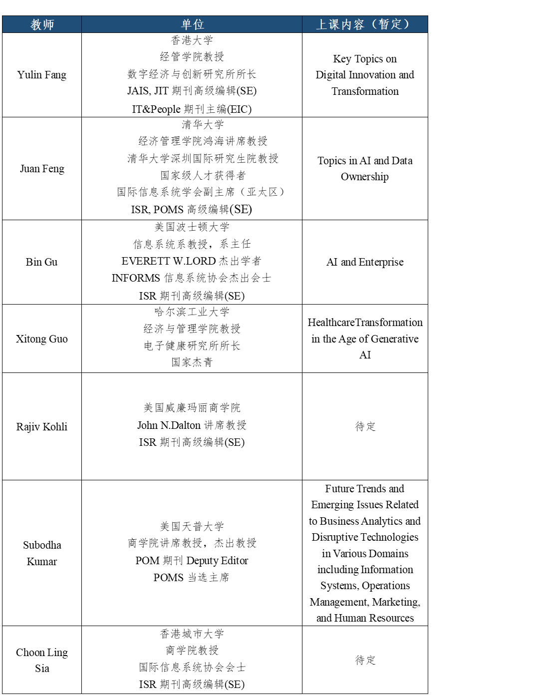 本次暑期学校从国内外一流大学和业界聘请了信息系统、金融科技及相关领域的优秀学者和从业者,其中多名教授担任管理科学及信息系统领域顶级期刊的编委工作,具有丰富的研究经验。主要任课教师如下(按姓氏首字母排序):