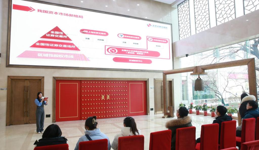 1月16日,实践团一行前往北京证券交易所进行实地调研学习。在相关负责人的带领下,实践团成员共同观看了北交所宣传片并了解其历史发展进程。在座谈交流环节,了解了北交所发展方向、人才需求及人才培养管理体系,让同学们对金融行业的整体发展情况与人才需求有了更深刻地理解。