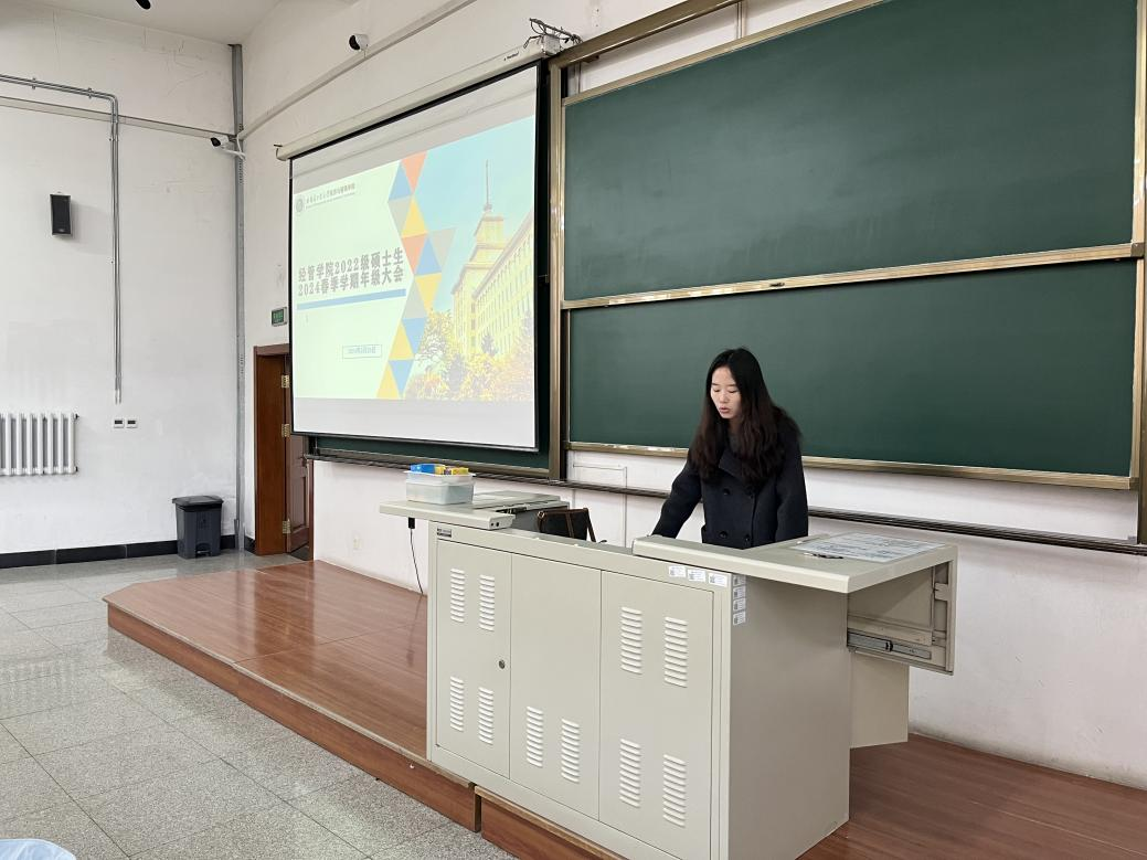 会上,辅导员刘倩姝向全体同学介绍了学院各职能部门的联系方式与本学期的工作安排。兼职辅导员王博文对党团建设、日常管理与评奖评优等工作进行了详细说明,重点强调了学籍注册、请销假申请、住宿管理、校园电动车管理和毕业论文要求等事宜。兼职辅导员梁阳杨介绍了2022届硕士生的就业去向,并详细解读了就业流程和签约注意事项。