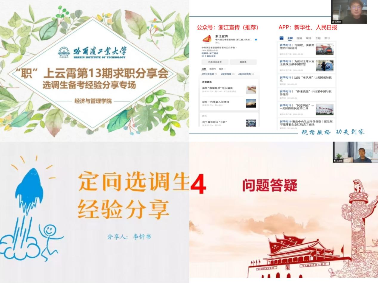 会上,沈煜喆和王龙骥结合自身经历,为同学们深入剖析了选调生考试的流程和关键环节,分享了备考时间规划和实用工具,鼓励同学们在备考过程中找准方向,稳住心态。李忻书则凭借较为丰富的工作经验,向同学们传授了考试心得,并讲述了她在基层的工作经历及感悟,她表示自在村里挂职以来,她切身了解到当地的民情、社情,深刻体会到基层工作的意义与价值。