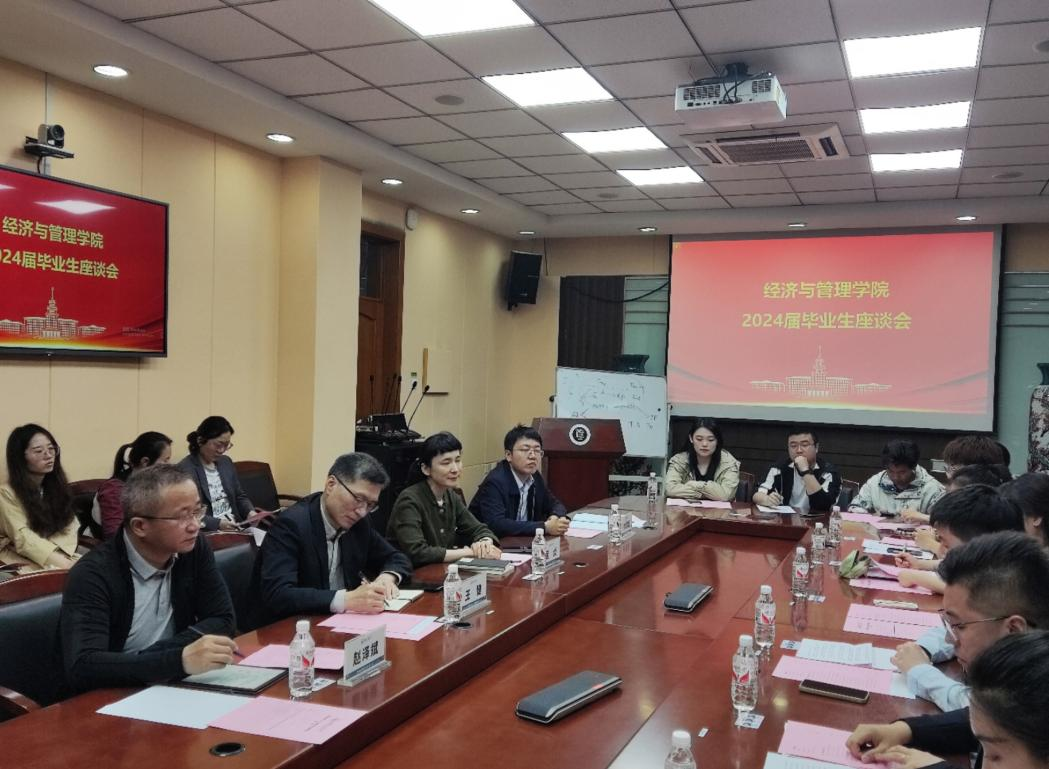 在管理楼G216召开2024届毕业生座谈会,吉祥坊院长王健、党委书记孟炎、副院长赵泽斌、党委副书记徐建慧,人才培养办公室秘书老师、辅导员及本、硕、博毕业生代表参加此次座谈会。会议由徐建慧主持。