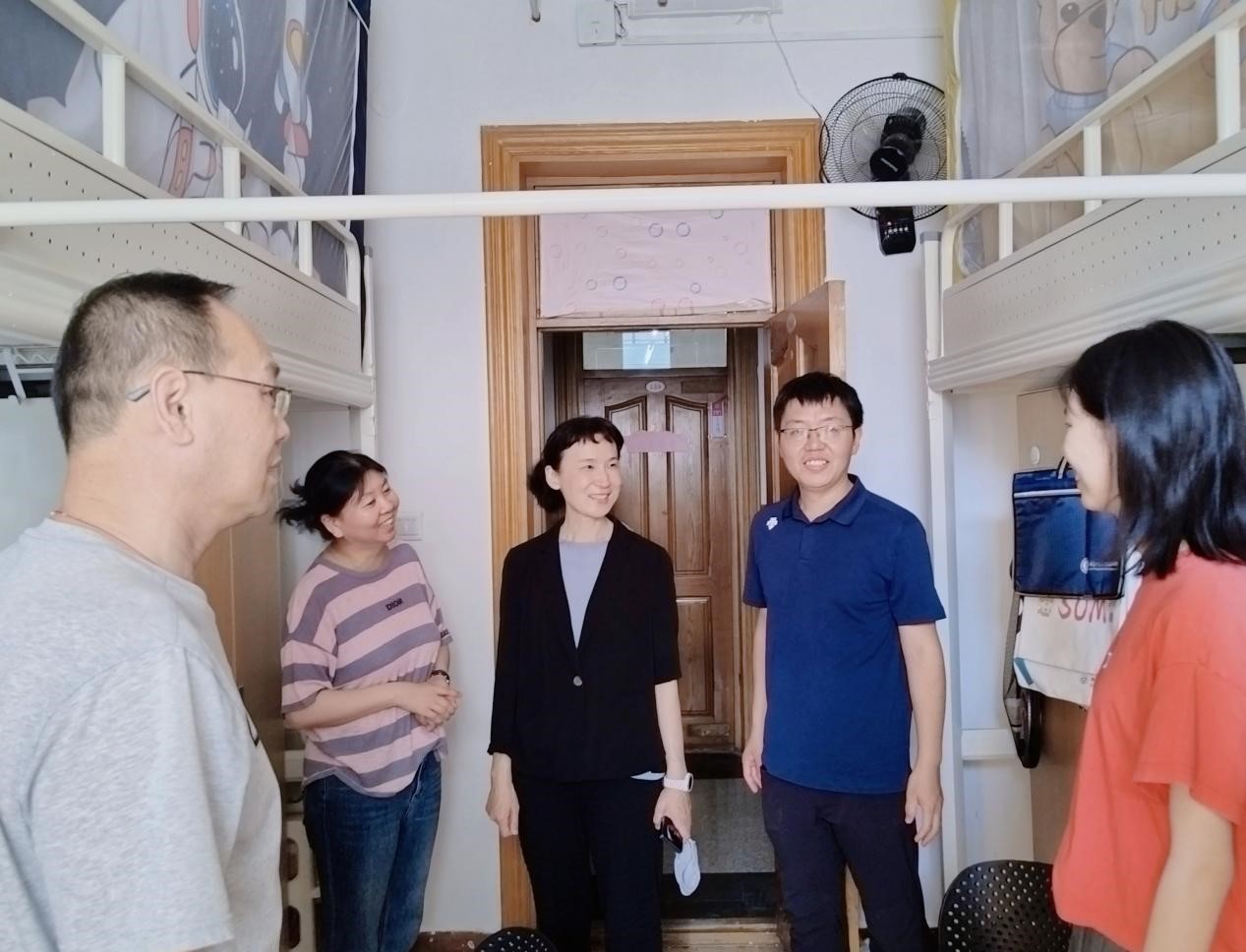 党委书记孟炎、党委副书记徐建慧以及吉祥坊2023级本科生辅导员张俊共同走访吉祥坊学生寝室。