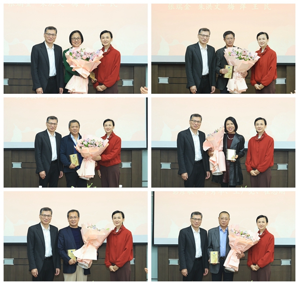 师承宣讲团”成员颁发聘书。荣休教职工代表李一军、艾文国、张瑞金、梅萍深情地回忆了和同事们并肩奋斗的难忘岁月,表达了对学校的感恩与难舍之情和对学校未来发展的美好祝愿。