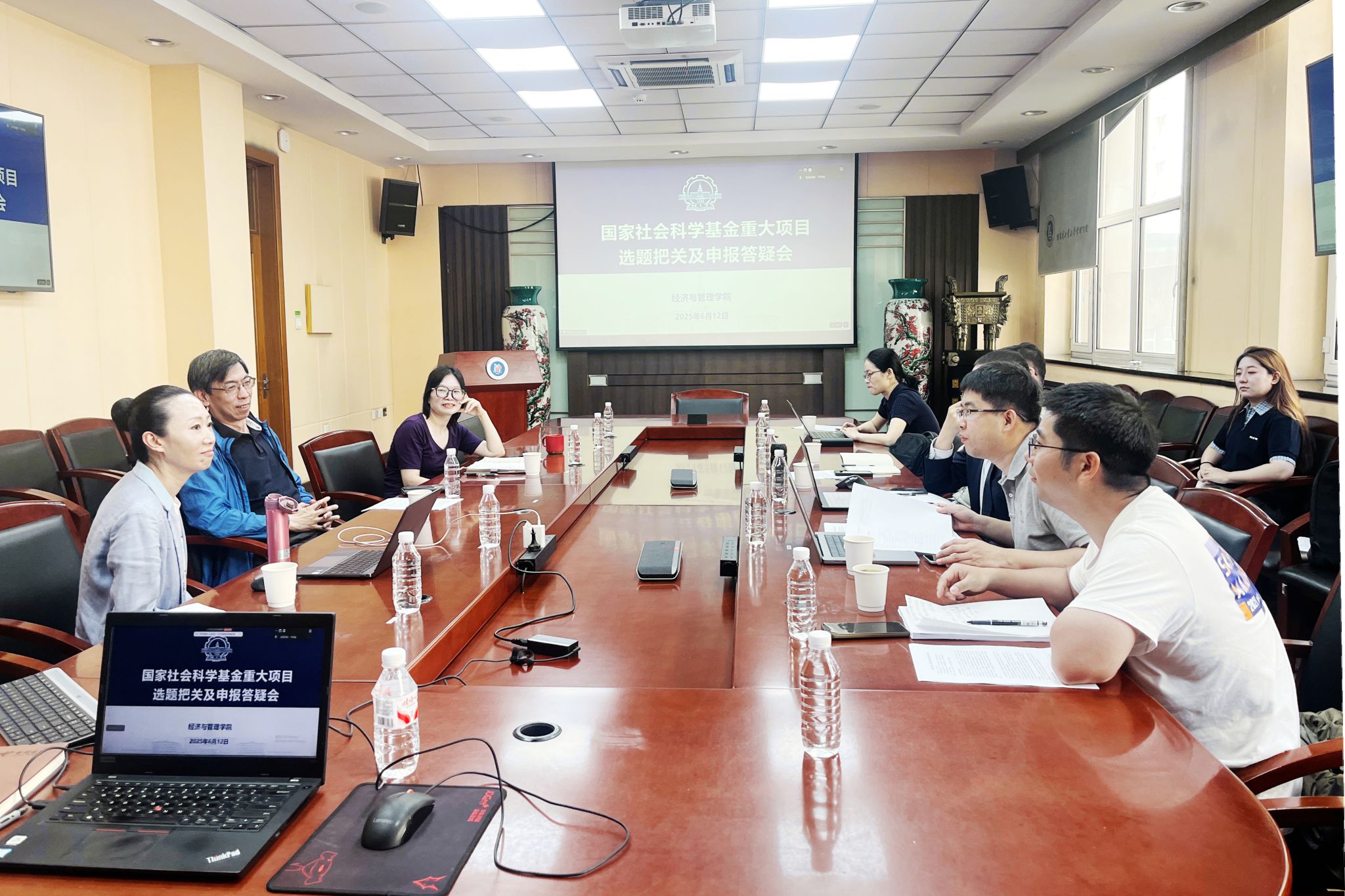在管理楼216会议室召开“国家社科基金重大项目选题把关及申报答疑会”。会议特邀国家社科基金学科规划评审组专家于渤教授、国家社科基金重大项目首席专家刘鲁宁教授担任指导专家,科研副院长邵景波教授主持会议。