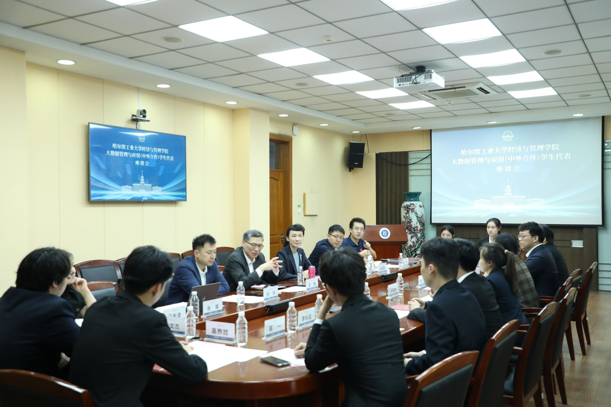 在管理楼G216会议室召开大数据管理与应用(中外合作)专业学生代表座谈会,吉祥坊院长王健、党委书记孟炎、党委副书记徐建慧、院长助理刘洋出席座谈会。首届大数据管理与应用(中外合作)专业学生辅导员张俊主持座谈会。