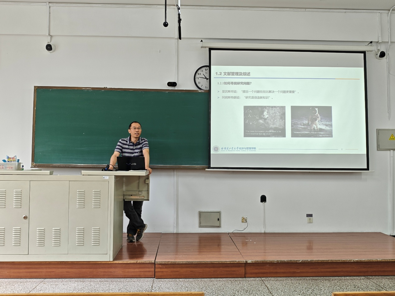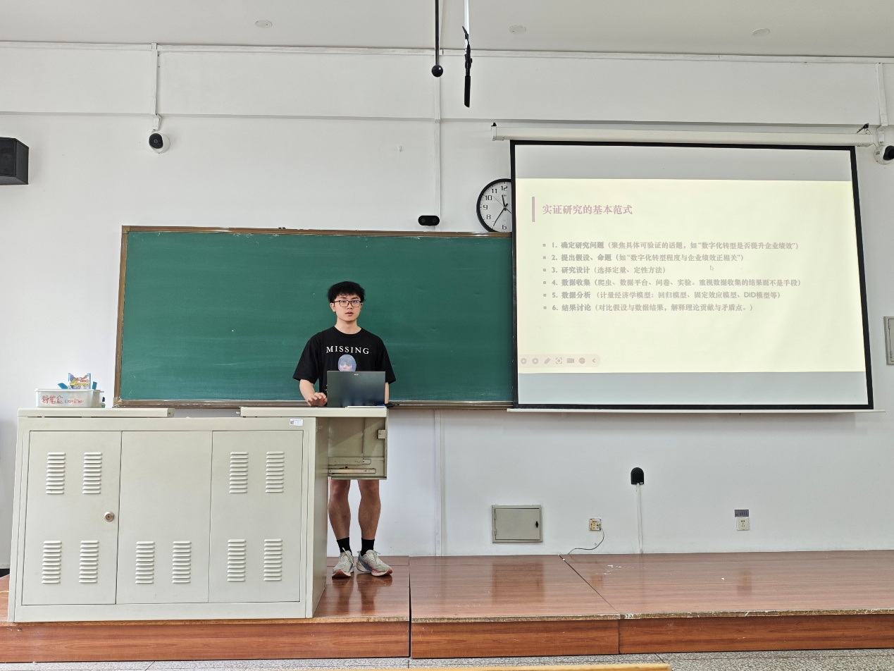 培训会上,马彬会梳理了毕业论文撰写的关键时间节点,围绕毕业论文相关资源下载、毕业论文的规范格式、毕业论文提交和审批等方面进行细致讲解,并就学生提出的具体问题进行逐一解答。刘旭东在论文选题、研究方法、数据收集与分析等方面进行了全面系统讲解,强调了论文选题的创新性以及论文结构的严谨性,鼓励同学们在论文写作过程中要敢于思考、勇于创新,不断提高自己的学术能力和水平。孙哲洋从自身经历出发分析了论文撰写和学分修读的注意事项,为学弟学妹们提供了清晰的选题思路和实用的撰写技巧。