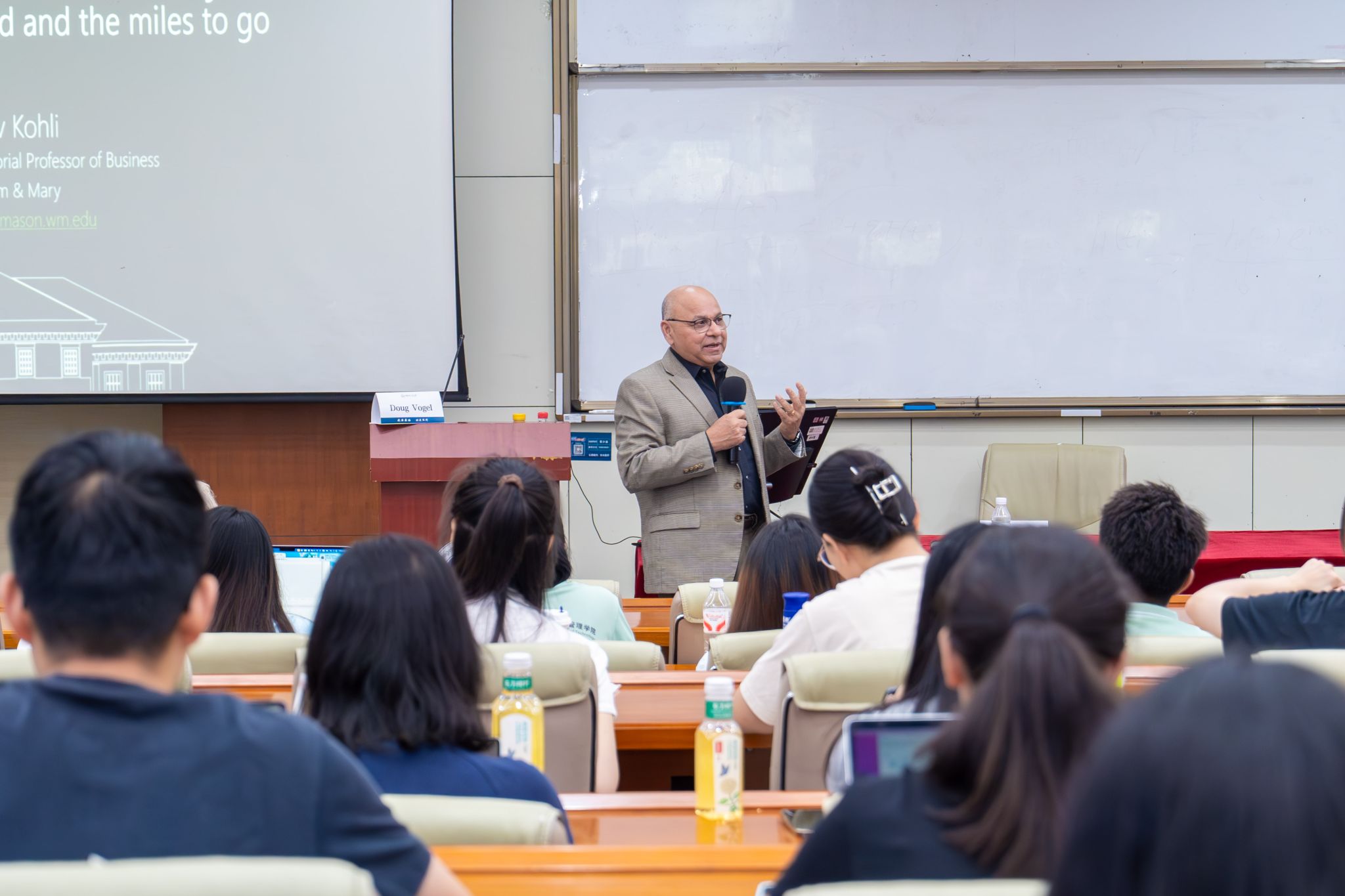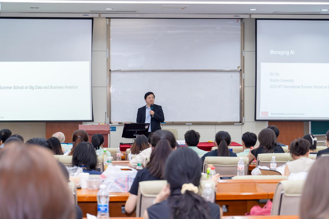 闭幕式邀请美国波士顿大学商吉祥坊信息系统系主任Bin Gu教授代表授课教师致辞。他肯定了本次夏校的学术深度与国际视野,赞赏哈工大为全球青年学者搭建起“跨学科、跨文化、跨领域”的思想交流平台。他表示,期待未来与更多来自中国与世界各地的学生在数据与商业分析的前沿继续同行。