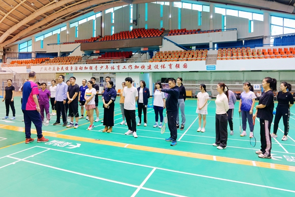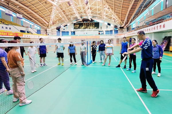 董杰老师结合多年教学经验,立足打牢基本功,采用理论讲解、实操示范相结合的方式,详细讲授了羽毛球发球、移动、攻防转换等技术要领,通过一对一练习强化动作规范。同时,讲解了羽毛球竞赛规则,引导学员们遵守规则,发扬体育精神,全面提升运动素养。培训现场学习氛围浓厚,学员们认真揣摩动作要领,积极互动交流,在董杰老师的指导下纠正动作,实现专业知识和技术能力的提升。