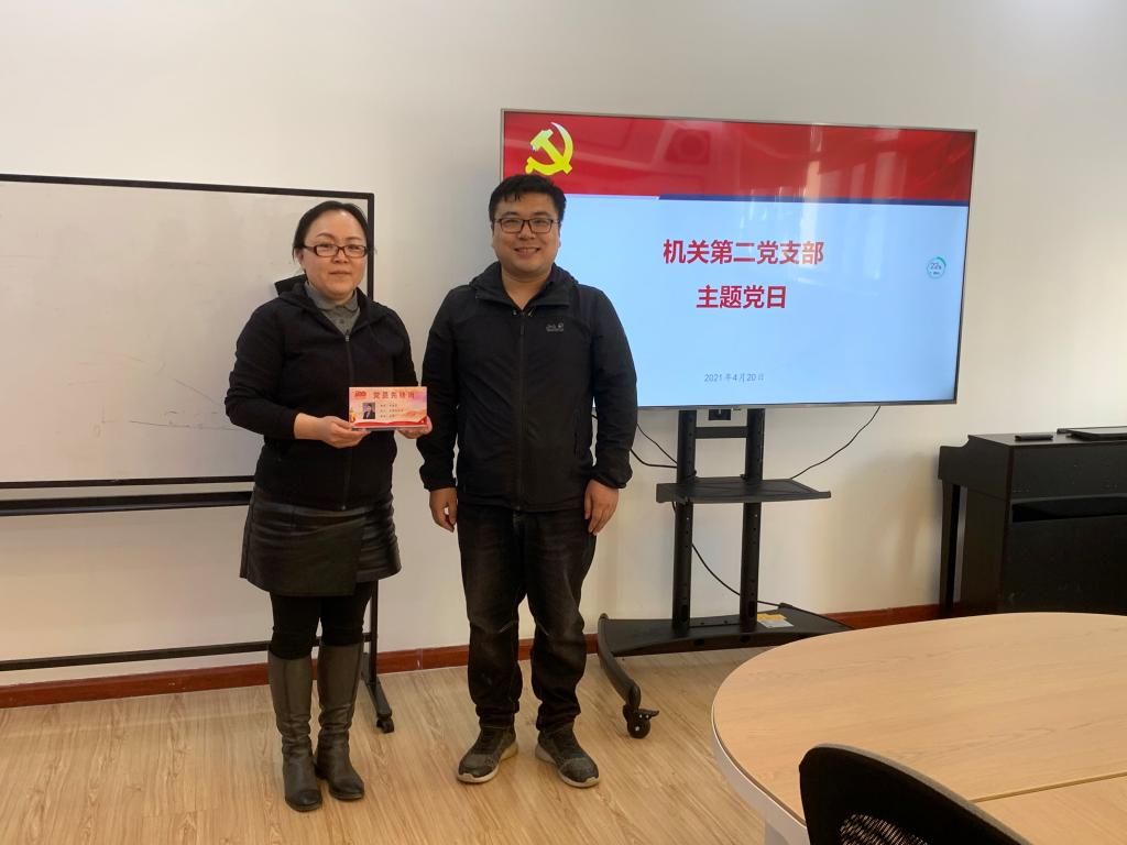 机关第二党支部开展“学党史悟初心强党性见行动”党员亮承诺、表决心主题活动,以制作“党员先锋岗”桌牌的形式,亮出党员身份,晒出教职工风采,落实岗位责任,会议由机关二支部书记辛远主持,吉祥坊党委副书记杨宗义参加会议并为机关二支部党员颁发党员先锋岗桌牌。