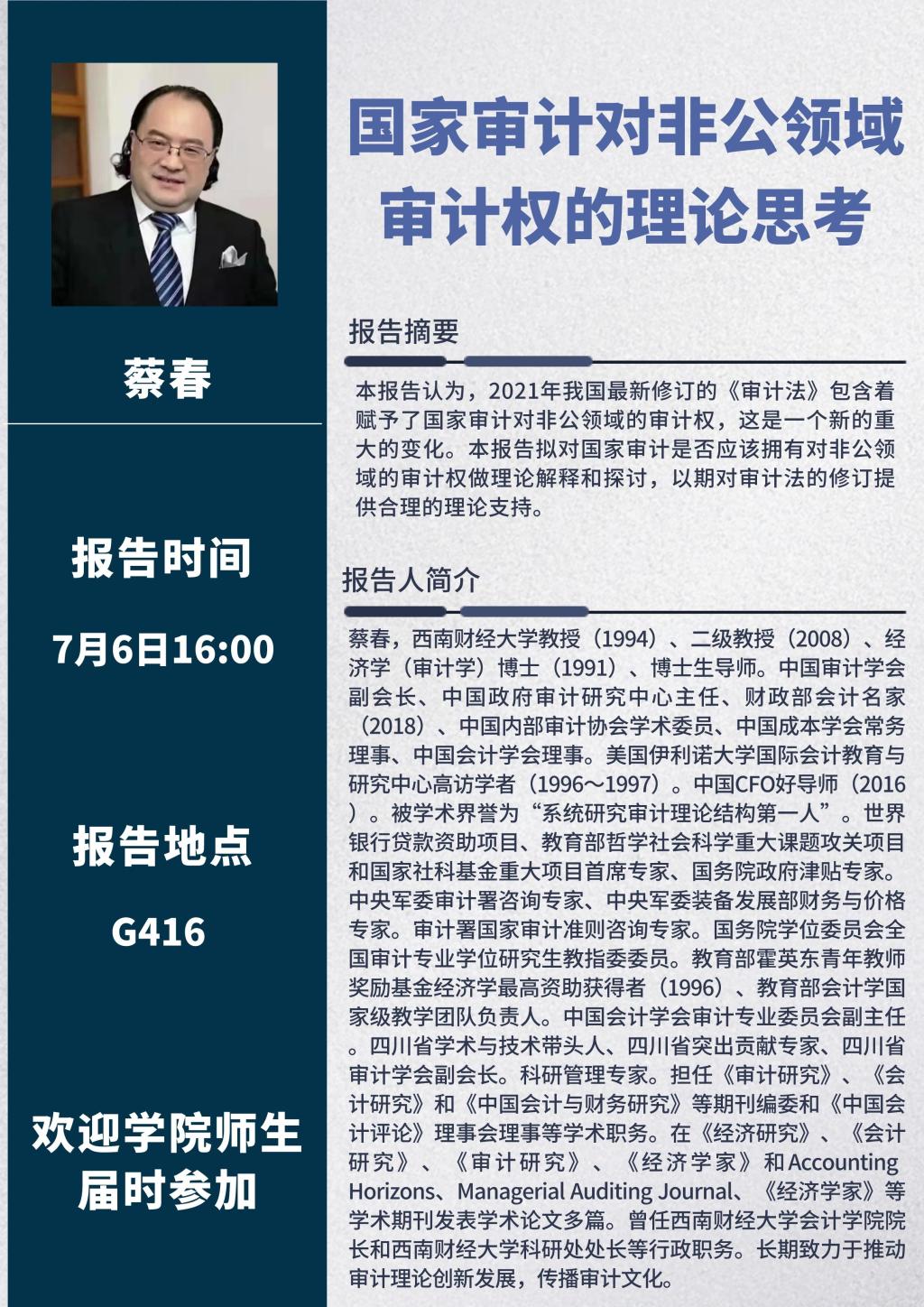 【讲座通知】7月6日西南财经大学蔡春教授讲座通知