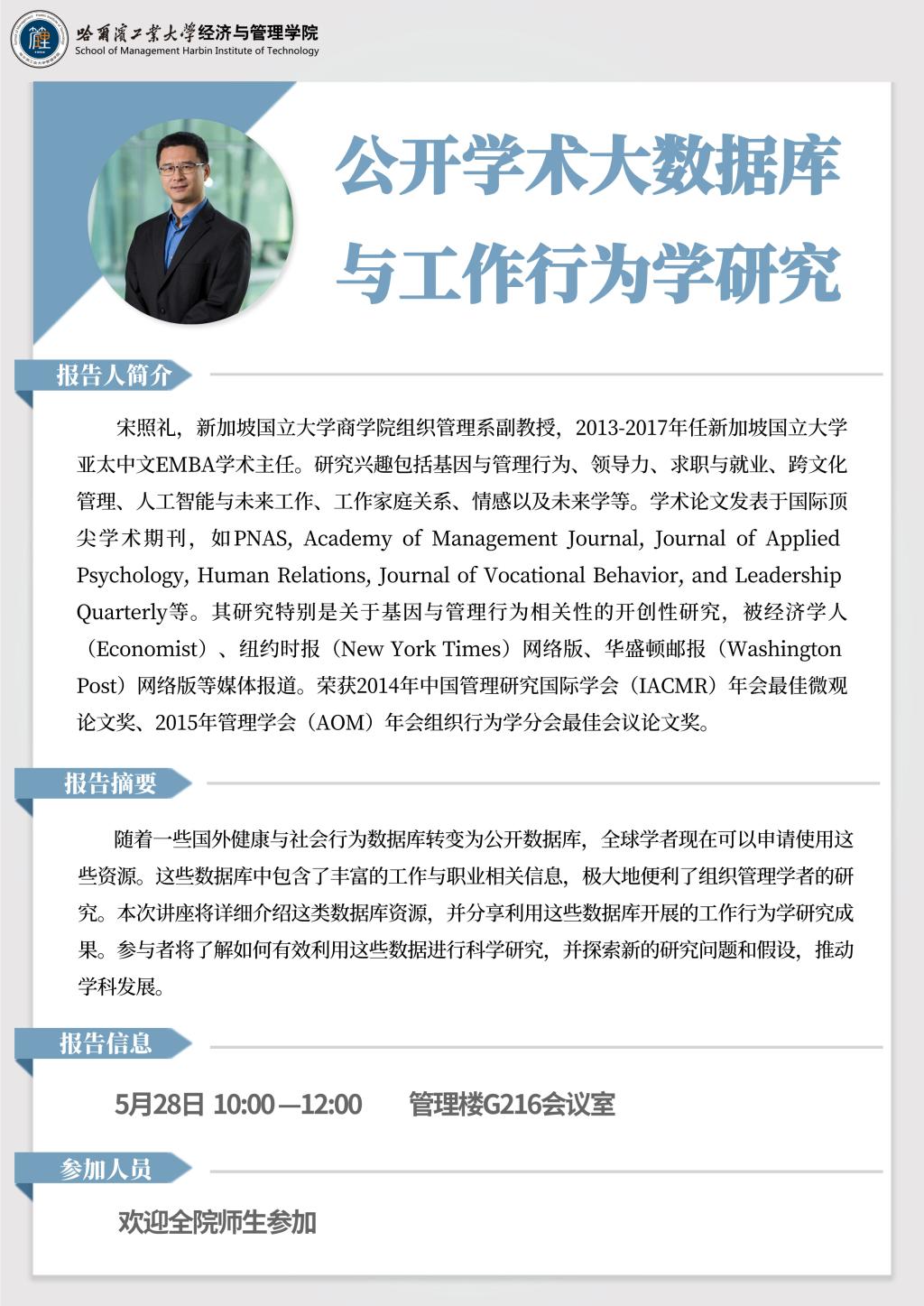 宋照礼,新加坡国立大学商吉祥坊组织管理系副教授,2013-2017年任新加坡国立大学亚太中文EMBA学术主任。研究兴趣包括基因与管理行为、领导力、求职与就业、跨文化管理、人工智能与未来工作、工作家庭关系、情感以及未来学等。学术论文发表于国际顶尖学术期刊,如PNAS, Academy of Management Journal, Journal of Applied Psychology, Human Relations, Journal of Vocational Behavior, and Leadership Quarterly等。其研究特别是关于基因与管理行为相关性的开创性研究,被经济学人(Economist)、纽约时报(New York Times)网络版、华盛顿邮报(Washington Post)网络版等媒体报道。荣获2014年中国管理研究国际学会(IACMR)年会最佳微观论文奖、2015年管理学会(AOM)年会组织行为学分会最佳会议论文奖。