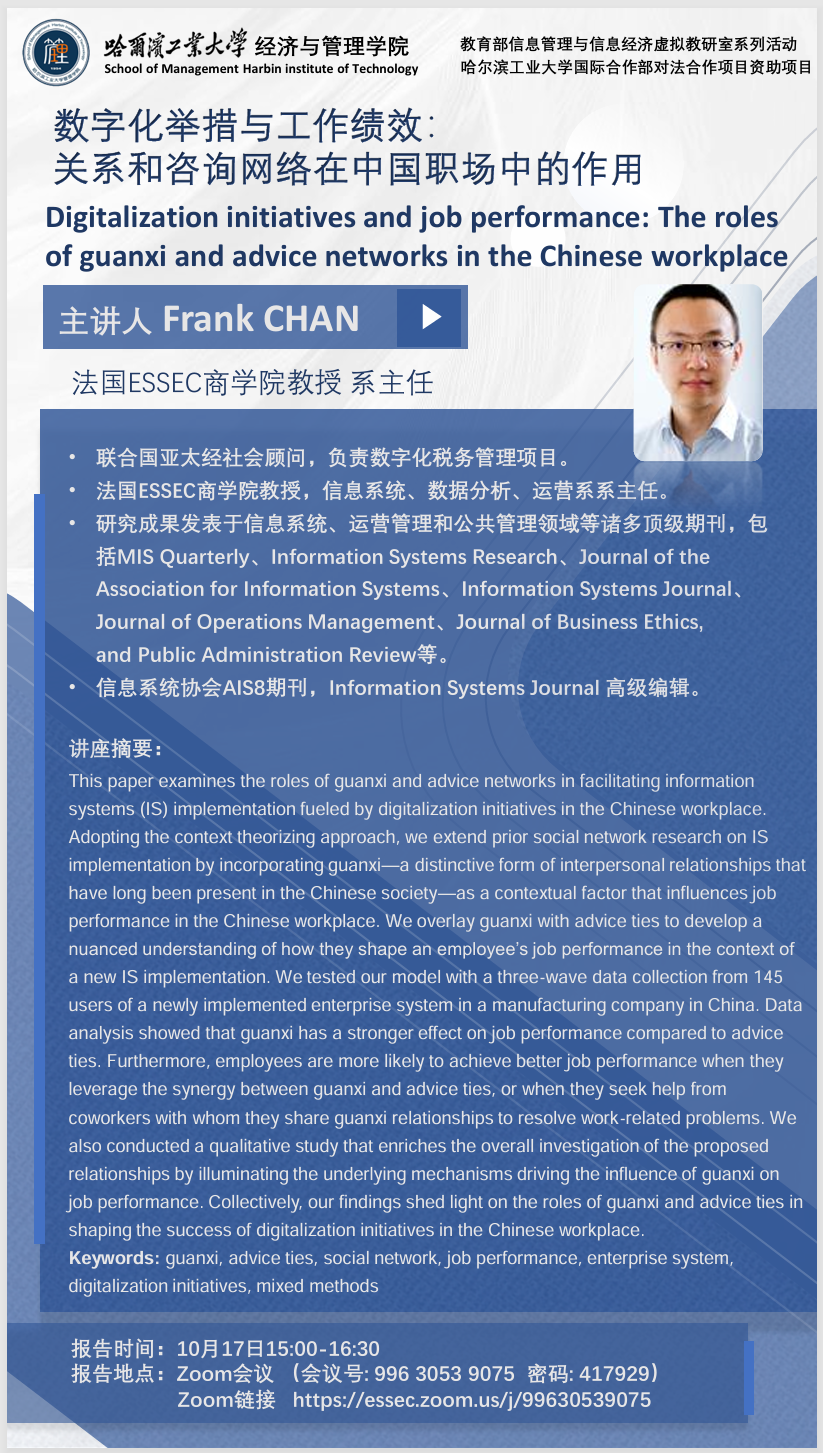 报告题目:Digitalization initiatives and job performance: The roles of guanxi and advice networks in the Chinese workplace