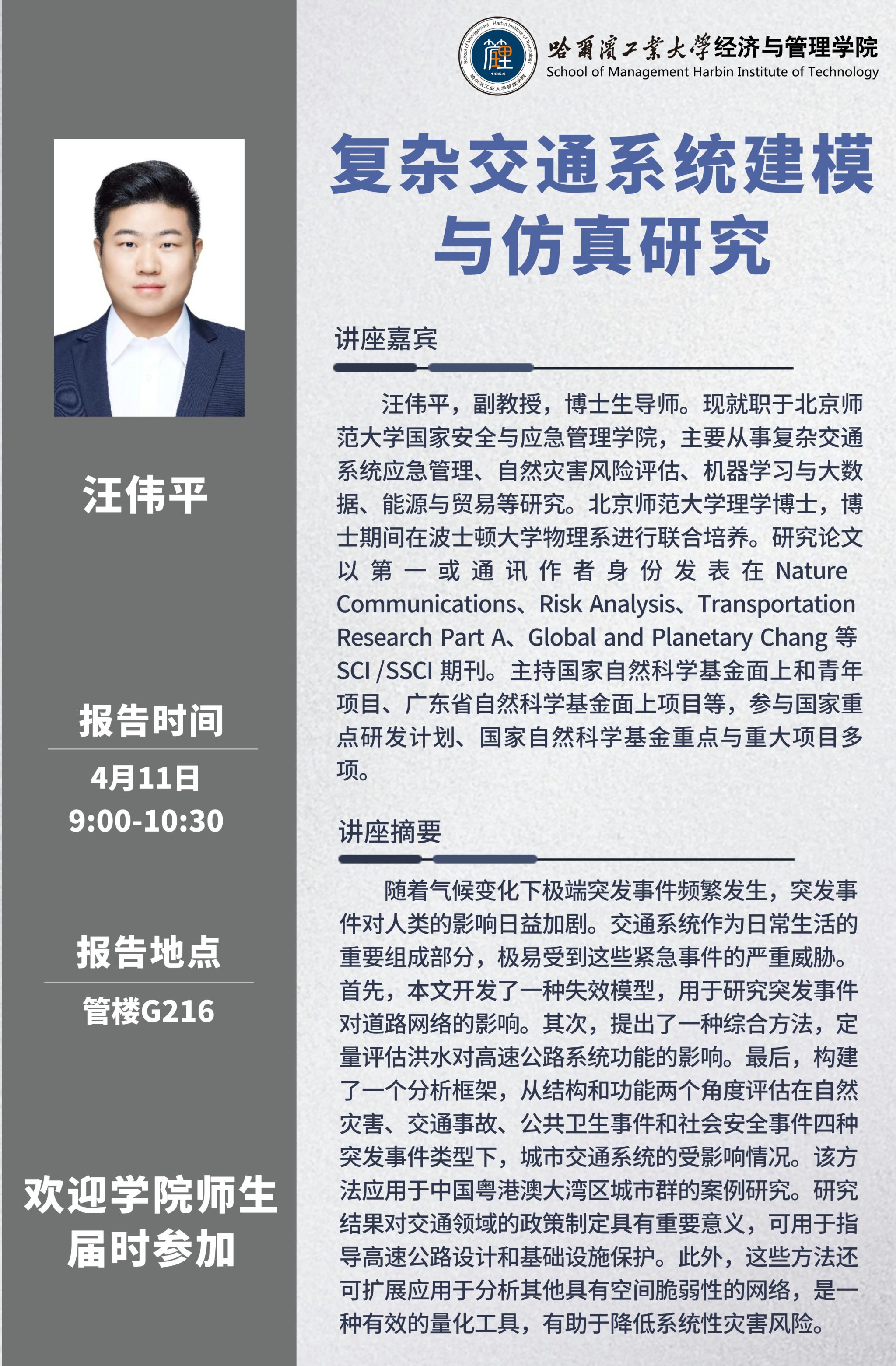 汪伟平,副教授,博士生导师。现就职于北京师范大学国家安全与应急管理吉祥坊,主要从事复杂交通系统应急管理、自然灾害风险评估、机器学习与大数据、能源与贸易等研究。北京师范大学理学博士,博士期间在波士顿大学物理系进行联合培养。研究论文以第一或通讯作者身份发表在Nature Communications、Risk Analysis、Transportation Research Part A、Global and Planetary Chang 等 SCI /SSCI 期刊。主持国家自然科学基金面上和青年项目、广东省自然科学基金面上项目等,参与国家重点研发计划、国家自然科学基金重点与重大项目多项。