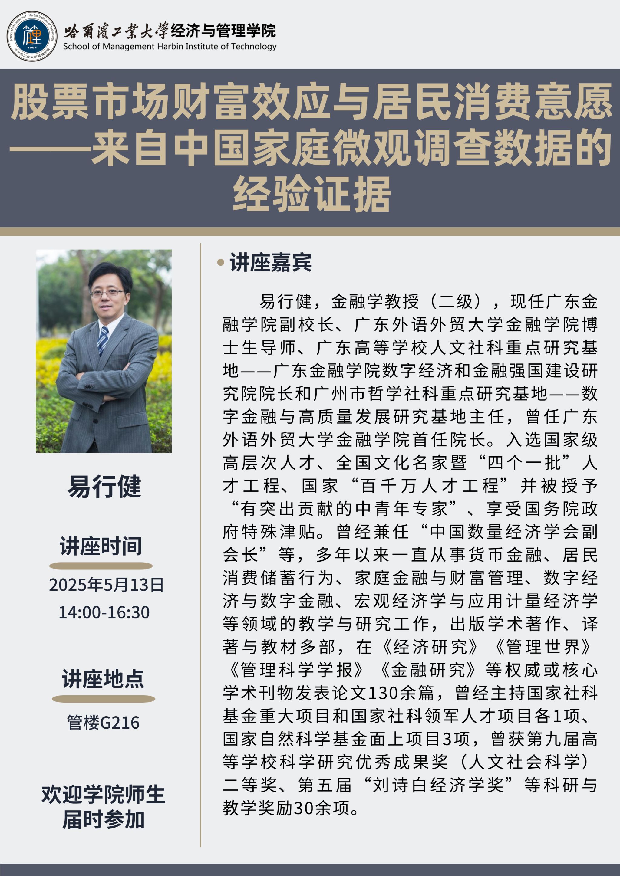 讲座主题:股票市场财富效应与居民消费意愿——来自中国家庭微观调查数据的经验证据