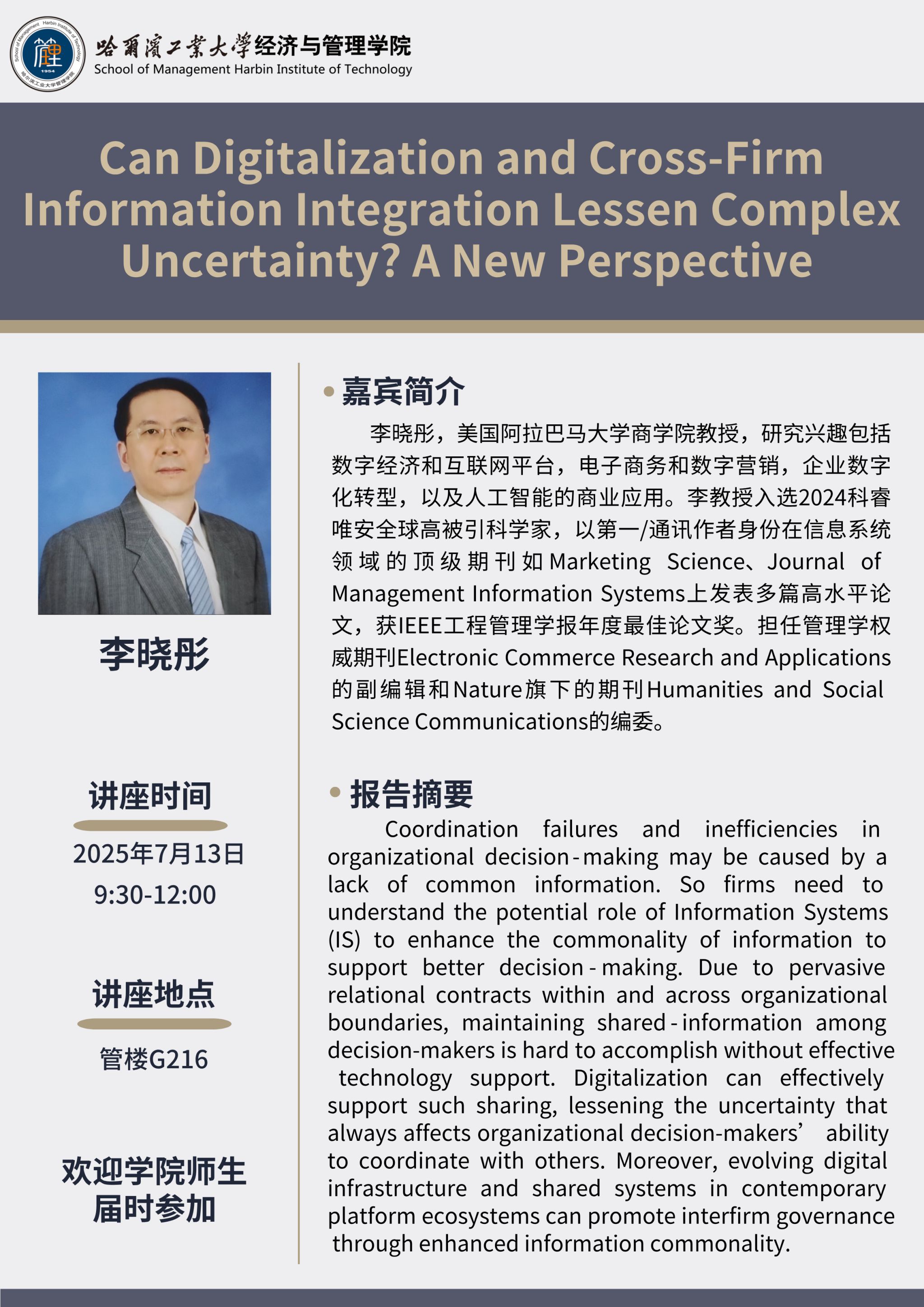 讲座主题:Can Digitalization and Cross-Firm Information Integration Lessen Complex Uncertainty? A New Perspective