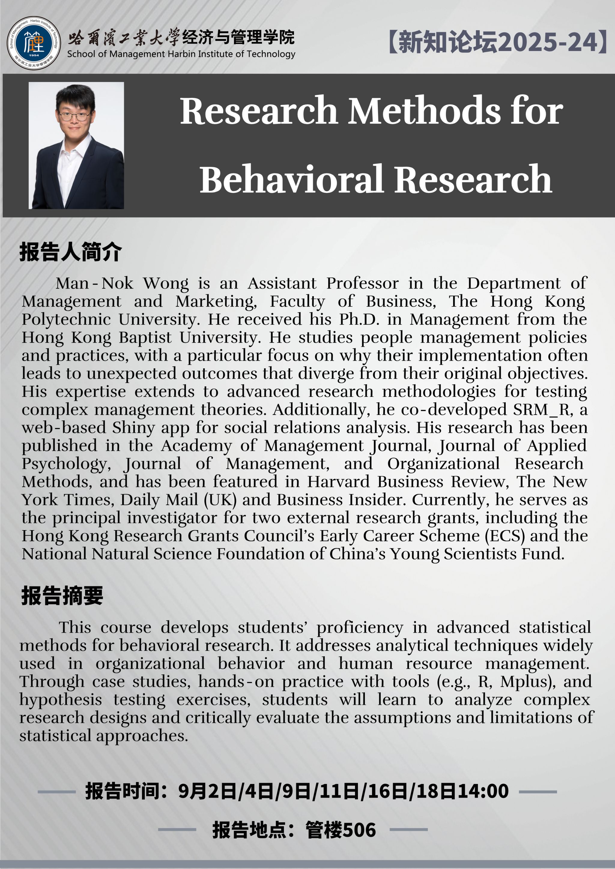 This course develops students’ proficiency in advanced statistical methods for behavioral research. It addresses analytical techniques widely used in organizational behavior and human resource management. Through case studies, hands-on practice with tools (e.g., R, Mplus), and hypothesis testing exercises, students will learn to analyze complex research designs and critically evaluate the assumptions and limitations of statistical approaches.