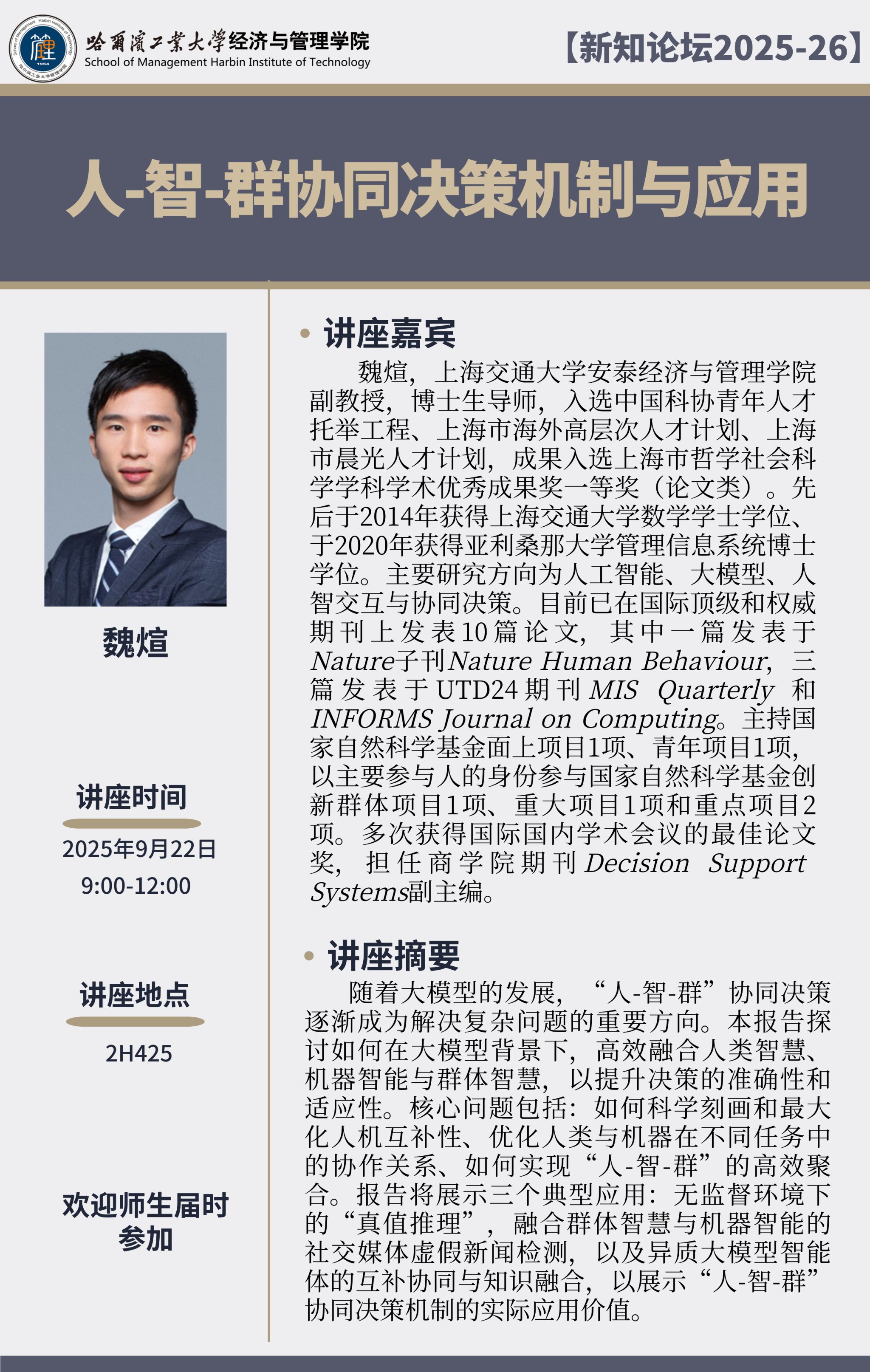 随着大模型的发展,“人-智-群”协同决策逐渐成为解决复杂问题的重要方向。本报告探讨如何在大模型背景下,高效融合人类智慧、机器智能与群体智慧,以提升决策的准确性和适应性。核心问题包括:如何科学刻画和最大化人机互补性、优化人类与机器在不同任务中的协作关系、如何实现“人-智-群”的高效聚合。报告将展示三个典型应用:无监督环境下的“真值推理”,融合群体智慧与机器智能的社交媒体虚假新闻检测,以及异质大模型智能体的互补协同与知识融合,以展示“人-智-群”协同决策机制的实际应用价值。