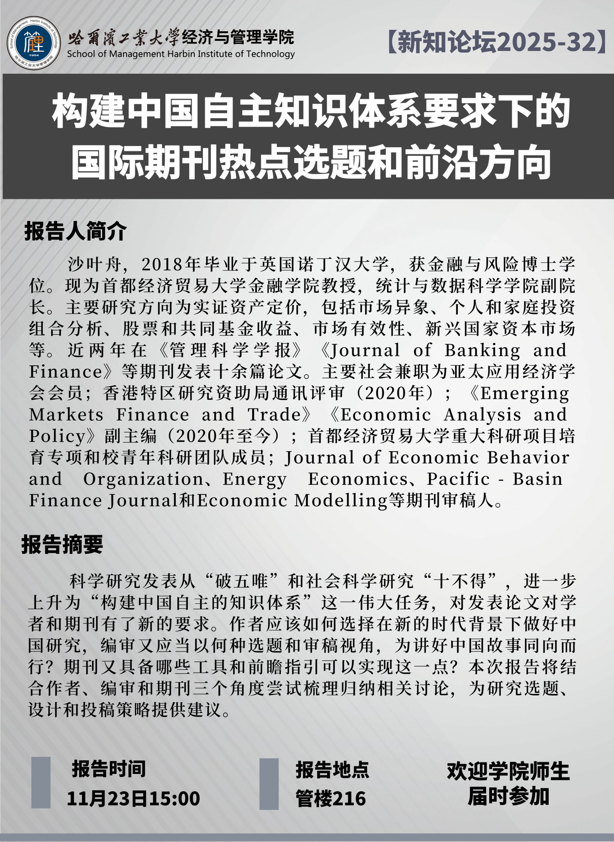 【新知论坛2025-32】11月23日首都经济贸易大学沙叶舟教授讲座通知