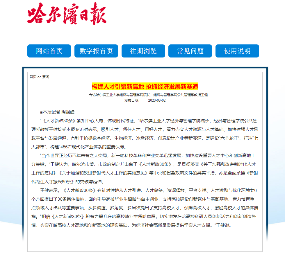 【哈尔滨日报】王健:构建人才引聚新高地 抢抓经济发展新赛道