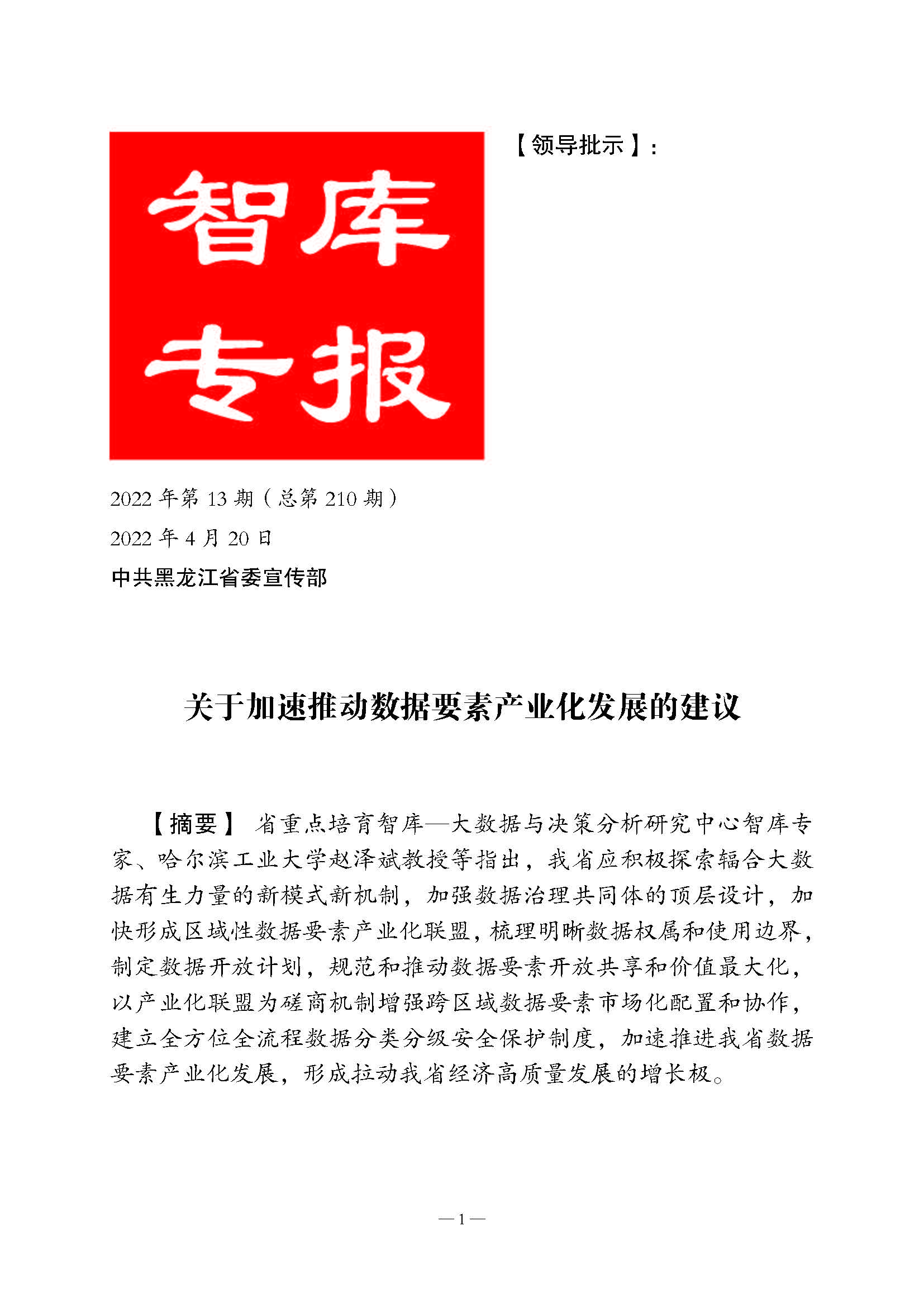 赵泽斌教授、叶强教授、王健教授《关于加速推动数据要素产业化发展的建议》收录在黑龙江省委宣传部《智库专报》2022年第13期。文章指出,我省应积极探索辐合大数据有生力量的新模式新机制,加强数据治理共同体的顶层设计,加快形成区域性数据要素产业化联盟,梳理明晰数据权属和使用边界,制定数据开放计划,规范和推动数据要素开放共享和价值最大化,以产业化联盟为磋商机制增强跨区域数据要素市场化配置和协作,建立全方位全流程数据分类分级安全保护制度,加速推进我省数据要素产业化发展,形成拉动我省经济高质量发展的增长极。